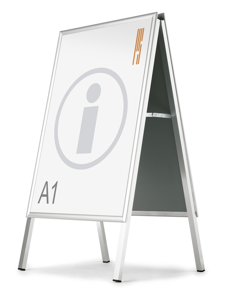 Caballete expositor de doble cara, estable y elegante. Perfecto para anunciarse en el exterior del establecimiento.