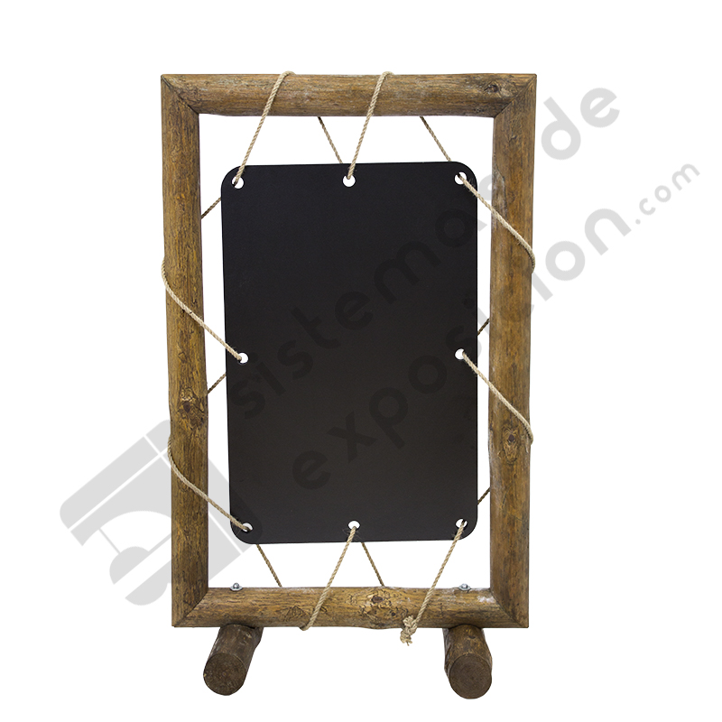 Pizarra de doble cara colgante sobre troncos de madera, fabricada con  pizarra de fibra de alta calidad y madera natural.