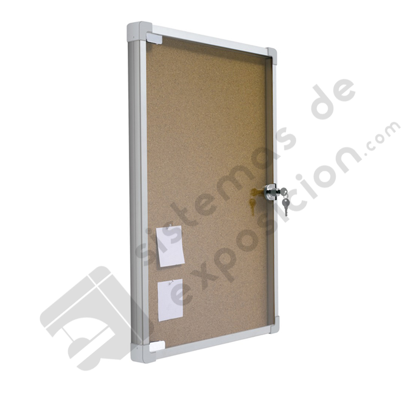 Vitrina para uso interior de aluminio, se puede colocar cualquier información con chinchetas (no incluidas). Dispone de cerradura para mayor seguridad. Las esquinas son redondas de color gris.